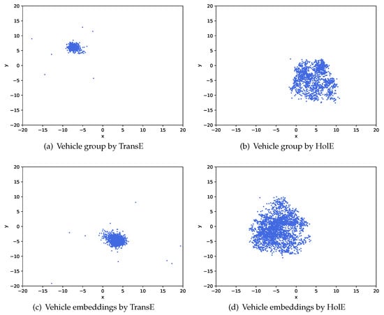 To further investigate the ability of model TransE and HolE, we visualize a part of the embeddings of vehicle group entities and vehicle entities by projecting them into a 2-dimensional space with the popular t-SNE [33] algorithm. It is known that a good embedding need to catch the intrinsic properties of entities by putting them properly into a low dimensional space. Figure 11 presents the visualization results of TransE and HolE under the enhanced THIN. The entity embeddings generated by TransE are extremely close and form circular-like and dense clusters. This is because it fails to model the many-to-many member relations in the enhanced THIN, which brings huge randomness in entity alignment. For HolE, the entities are distributed well and separated broadly into several blocks. These embeddings can discriminate different entities according to their relationships to others and thus contain the intrinsic properties in their components. The visualization results additionally justify the advantages of HolE in Section 4.3.