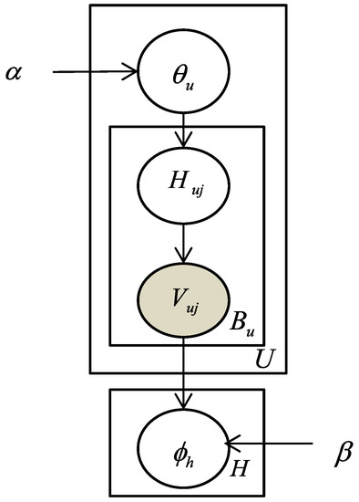 Latent Dirichlet allocation (LDA) is an unsupervised probabilistic generative model for describing the latent topics of documents [35]. It models each document as a distribution over topics and each topic as a distribution over words. These distributions are followed by the Dirichlet distribution. Let and represent the set of users and the bag of words determined by a user , respectively. Let be the set of specific words showing up in a bag of words at least once for a user . Here, expresses the set of latent topics, and the volume of topics is given as a parameter. In LDA’s generative procedure, each user has his/her own preference over the topics expressed by a probabilistic distribution that is a multinomial distribution over , denoted by , and each topic also has to follow a multinomial distribution over , expressed by .