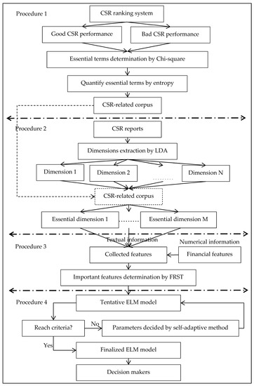 The flowchart of LDA_ELM_SA model. Abbreviations: CSR—corporate social responsibility, FRST—fuzzy rough set theory, ELM—extreme learning machine, SA—self-adaptive.