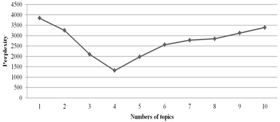 Independent indicators—it is widely recognized that the relationship between corporate operating performance and corporate financial crisis is significantly positive. Thus, the chosen indicators in financial crisis assessment must be reliable in order to become the surrogate for joining up with the independent indicators. The independent indicators implemented herein can be divided into two main categories: (1) numerical financial ratios derived from financial statements and (2) textual indicators derived from CSR reports. To extract the inherent information from multi-dimensional CSR reports, we executed LDA to break down these reports into some manageable dimensions. Perplexity is a commonly used measure in information theory to determine the optimal number of topics as well as to represent how well the model describes a dataset. The lower the perplexity is, the more superior the probabilistic model is [35]. According to the result (see Figure 3), we preserved four topics: environment–business-related dimension (EBRD), product–business-related dimension (PBRD), community–business-related dimension (CBRD), and customer–supplier-related dimension (CSRD).