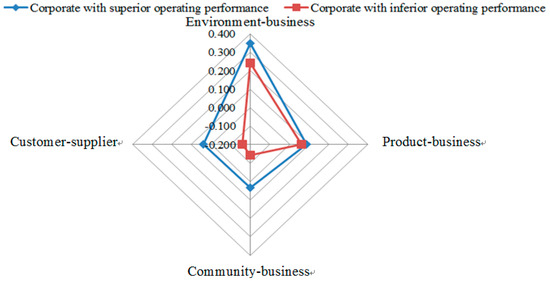 Figure 4 illustrates the difference of each CSR-related dimension between a corporation with superior operating status and a corporation with inferior operating status. The result reveals that a corporation with superior operating performance played a satisfactory job in CSR performance among all assessing criteria. This finding corresponds to the previous work done by McGuire et al. [60] who stated that a corporation with better CSR performance may face relatively lower capital constraints, fewer labor problems, and consumers who may be favorably disposed to its products as well as enhance its economic benefits. Furthermore, a corporation with better CSR performance may also have a lower financial risk owing to sustaining much more stable relations with the public sectors and financial communities.