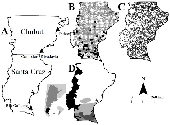 Study area. (A) Location and provinces (light grey = South America, dark grey = Argentina, black = Santa Cruz, black triangles = meat and wool industries); (B) provincial farms cadastre (680 productive sheep farms) and sample sites (black dots); (C) primary and secondary transport routes; (D) ecosystems (light grey = central plateau grasslands, middle grey = mata negra shrubland, grey = humid Magellanic steppe, dark grey = dry Magellanic steppe, black = Andean grasslands).