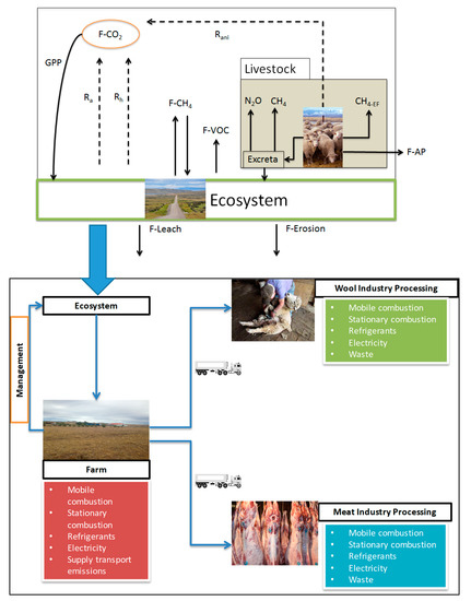 - Cottle, D.J.; Cowie, A.L. Allocation of greenhouse gas production between wool and meat in the life cycle assessment of Australian sheep production. The International J. Life Cycle Assess. 2016, 21, 820–830. [Google Scholar] [CrossRef]