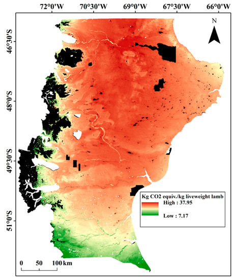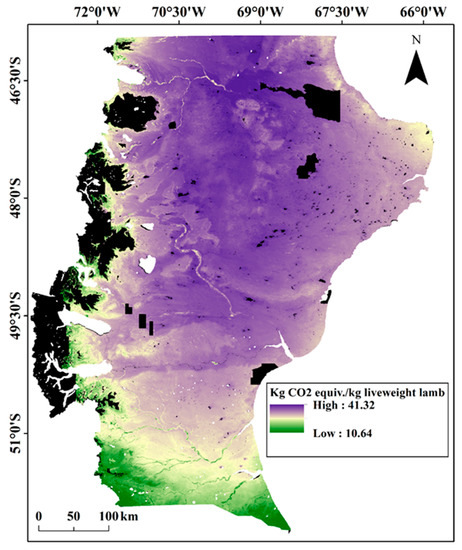 To build maps of the carbon footprints (kg CO2-eq/kg) of live weight lamb and wool animal transport, first we calculated the accumulated distances (km) from each pixel in the map to the industrial processing facilities (origin of the production to the final destination in the local industry). For this, we defined Río Gallegos and Comodoro Rivadavia as the final destinations for live lambs, and Trelew as the final destination for greasy wool. The modeling was performed considering for each pixel the Euclidean distance to the closest road and the accumulated minimum distance to the final destination of the existing road network. Each map was the combination of the accumulated minimum distance and the Euclidian distance. When two possible destinations existed, the modeling selected the minimum distance (e.g., Rio Gallegos or Comodoro Rivadavia). Finally, we applied the same mask to remove areas without analysis, as was applied in the carbon footprint production analyses. The accumulative distances (km) to Rio Gallegos ranged from 0 to 973 km, for Comodoro Rivadavia they ranged from 24 to 978 km, and for Trelew from 412 to 1366 km. The final two maps of carbon footprints were the combination of production, transport, and processing of live lamb and wool.