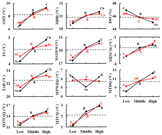 Mean values of carbon footprint at farm gate (kg CO2-eq/kg product) for the Santa Cruz province (dotted line) and ANOVAs for temperature (°C) variables classified according to the carbon footprint map for live weight lamb (black) and wool (red). Capital letters show differences among carbon footprint map classes (low, middle, and high) and lowercase letters show differences between products (lamb and wool) using Tukey test at p < 0.05.