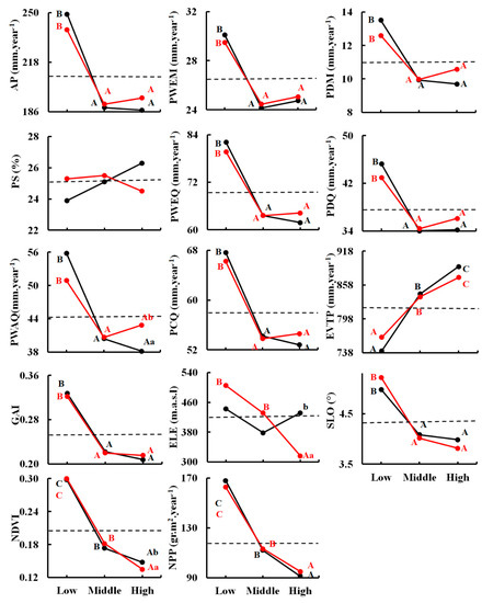 Mean values of carbon footprint at farm gate (kg CO2-eq/kg product) for the Santa Cruz province (dotted line) and ANOVAs for precipitation, topographic, and vegetation variables classified according to the carbon footprint map of live weight lamb (black) and wool (red). Capital letters show differences among carbon footprint map classes (low, middle, and high) and lowercase letters show differences between products (lamb and wool) using the Tukey test at p < 0.05.