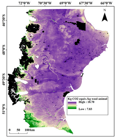 With the carbon footprint of live weight lamb and wool (kg CO2-eq/kg) models, we obtained two final maps for the entire Santa Cruz province (Argentina), where the variables derived from the multiple linear regression models were integrated into a geographical information system (GIS) using ArcMap 10.0 software. Then we applied a screening criteria to remove areas with: (i) NDVI < 0.05, which included glaciers, water bodies, rocks, and areas without vegetation cover [37], (ii) elevation > 1200 m.a.s.l., where livestock activities are not practiced due to extreme climate, and (iii) natural protected areas.