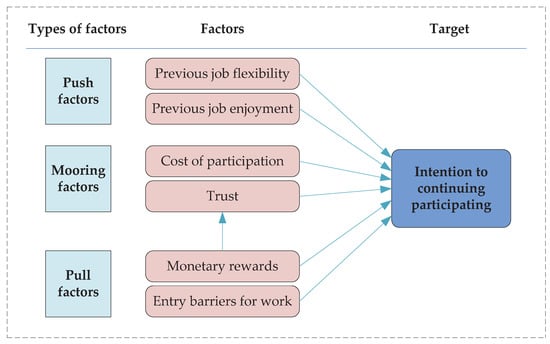 This paper proposes several research hypotheses based on the three PPM aspects (push, pull, and mooring) and analyzed the specific factors that affect crowd workers’ continued intentions to participate in crowd logistics. Push factors include flexibility and enjoyment from the previous job, pull factors include monetary rewards and entry barriers for work, while mooring factors include trust and the cost of participation.