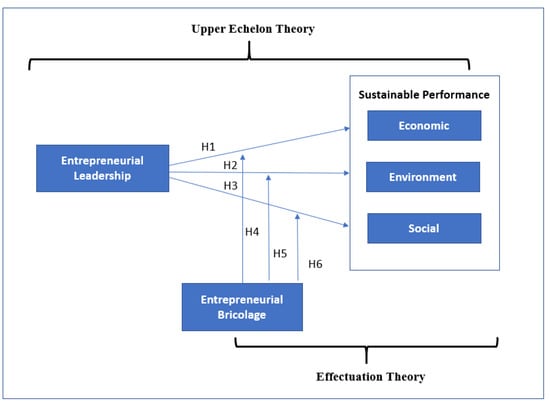 Extant literature is confined to examining the relationship between EL and innovative behavior. For instance, [] confirmed that EL plays an important role in developing and pursuing innovative organizations through the innovation process (idea generation, idea selection, idea development, and idea diffusion). Entrepreneurial leaders are required to promote new products and processes, as well as to endorse new strategic directions and solve complex business, social, and environmental problems []. However, there has been no direct investigation on the role of EL in influencing sustainable performance.