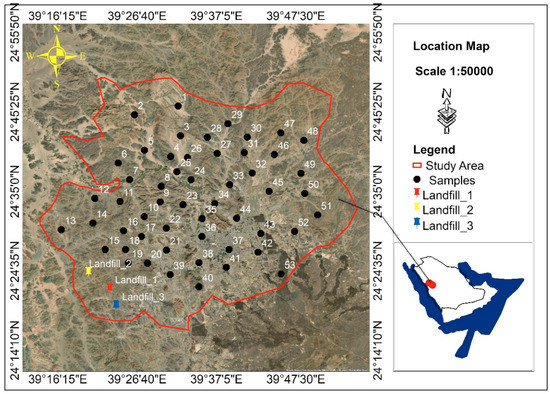 The Kingdom of Saudi Arabia (KSA), located in an arid environment, has limited renewable water resources [1]. There is a potential risk of water scarcity in the future due to a rapidly changing climate and anthropogenic activities [2]. The kingdom depends largely on the desalination of seawater and groundwater for different purposes such as drinking, irrigation, and industry [3]. Al-Madinah City is located in the western part of the KSA, and attracts a preponderance of religious tourists. It mainly depends on groundwater to meet its water requirements. Al-Madinah is one of the most significant cities in the KSA for historical and religion reasons. Various agricultural farms around Al-Madinah city conduct important agricultural activities including vegetables, dates, and alfalfa production. In Al-Madinah, there is a water stress due to the rapidly increasing population, extensive pumping out of groundwater resources, and prevalence of arid to semi-arid conditions [4]. This stress has undoubtedly led to the deterioration of the groundwater [1,5]. Hydrochemical characteristics including cations, anions, heavy metals, nitrates, chlorides, and organics of the groundwater to determine water quality indices should be used to help sustain the groundwater [6,7]. The chemical characteristics of groundwater, such as pH, dissolved salts and gases, metals, and organics, are controlled by the exchange of cations within the geological aquifer, dissolution of minerals, and evaporation and redox reactions [8,9]. Spatiotemporal assessment and monitoring of the groundwater are essential for sustainability [10].