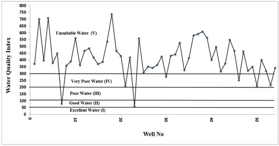 The calculated values of the water quality index (WQI) of the groundwater samples collected from Al-Madinah City, Western Saudi Arabia.