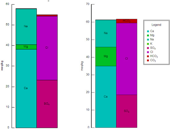 The Piper and Schoeller [45] diagrams (Figure 4) revealed that the main water type identified in the Al-Madinah groundwater was calcium–magnesium/sulfate–chloride, and this represented 74% of collected samples. However, 26% of samples showed a water type of sodium–potassium/sulfate–chloride. These water types indicated that the geological composition in the area was mainly gypsum, anhydrite, and halite.