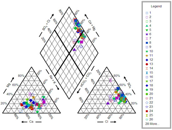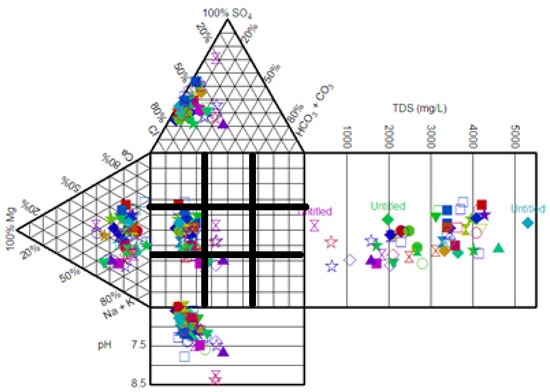 To investigate the hydrochemical characteristics of the collected water samples, the Piper, Schoeller, and Durov diagrams were constructed by using Geochemistry Software AquaChem 2014.2 to identify the water type [39,40]. In addition, hazards due to salinity, sodium adsorption ratio (SAR), total hardness (TH), and Kelly’s ratio (KR) were computed.