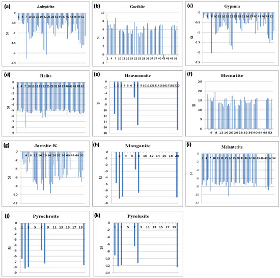 Mineral saturation indices of the groundwater samples collected from Al-Madinah City, Western Saudi Arabia (a): anhydrite, (b): geothite, (c): gypsum, (d): halite, (e): hausmannite, (f): hematite, (g): jarosite-K, (h): manganite, (i): melanterite, (j): pyrochroite, and (k): pyrolusite.