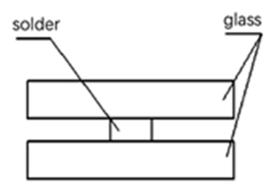 The two soda-lime glass sheets’ dimensions of 30.0 mm × 30.0 mm × 4.0 mm are used in the experiments. Based on the principle of equal thickness interference, the elastic modulus of the glass is measured. The air film wedge is formed on the upper surface of the standard plate glass and the lower surface of the plate glass to be measured. The distribution of the equal thickness interference fringes of the plate glass are to be measured under natural and stress conditions, respectively, and the elastic modulus of the glass is 72.45 MPa, the Poisson’s ratio is 0.22, tensile strength is 40 MPa, compressive strength is 880 MPa (the tensile and compressive strength are selected according to the lower limit), PbO-TiO2-SiO2-RxOy powder is used as the solder, and the composition and the indicators are shown in Table 1.