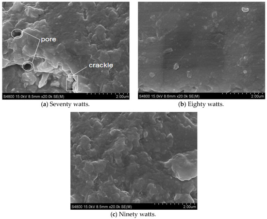 Figure 3 shows the microstructure of 70-W, 80-W, and 90-W laser power, respectively. The laser power directly affects the temperature gradient, cooling rate, and the stability of the welding process of the sealing layer, so it has different effects on the pores and cracks in the sealing layer. As shown in Figure 3a, when the sealing power is 70 W, it can be seen that there are many large-diameter pores in the sealing layer, and the distribution is centralized, and the hole depth is obvious. Due to the incomplete melting of the solder, less liquid phase, and higher melt viscosity, the sealing surface is uneven and the stress between solder particles is concentrated, so there are rough cracks of different lengths.