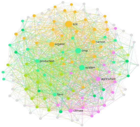 - The influential words highlight the importance of crop systems and soils, which means that most of the literature focuses only on soil quality and health while neglecting other ecosystem services. This can be justified, according to Doran [39], by the fact that soil quality and health is the primary indicator for sustainable management and is vital to the functioning of the global ecosystem.