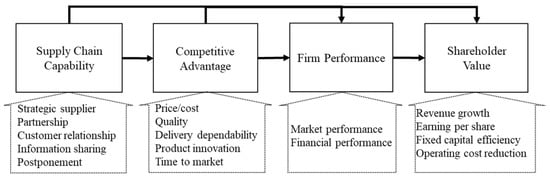 Researchers in various fields have published numerous articles with diverse research designs that examine the financial impacts on supply chain capability (SCC). Supply chain management (SCM) has a significant impact on a company’s financial performance and stock price [1,2,3,4,5]. Supply chain management has a direct impact not only on financial indicators but also the marketing performance of an organization [6], such as increased market share and return on investments [7,8], lower total costs [9], improved customer relations [10], and increased operational efficiency, which includes higher-order fulfillment rates and shorter-order cycle times [9]. It also influences competitive advantage [6,11], and the supply chain strategy has a central position in creating shareholder value (SHV) [12] to assure sustainable supply chain [13].