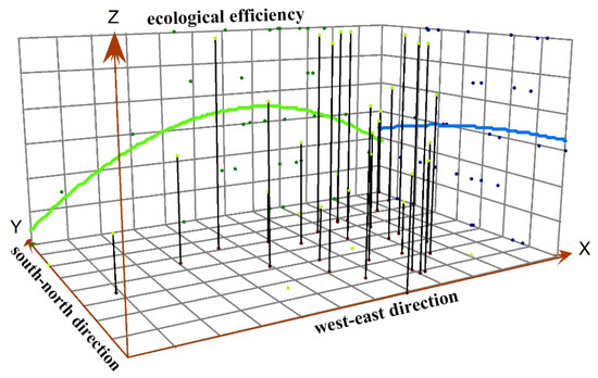 In this paper, China’s regional ecological efficiency is measured by taking advantage of the window DEA model in the preceding part of the text and using MAXDEA Pro 6.4 with the results from Table 3. On the whole, the regional ecological efficiency of most of provinces in our country was zero for a long time. Within the investigation period of samples, the mean value of ecological efficiency of the eastern region is between 0.729 and 0.963, while that of the central region is between 0.606 and 0.775; in the western region, the value is between 0.586 and 0.65. The ecological efficiency among the eastern, central, and western regions is significantly different (in Figure 1). In order to further understand the provincial and regional differences of Chinese regional efficiency, in the paper, we took the year 2016 as an example, and the spatial distribution tendency of China’s regional ecological efficiency was visually described by using the tendency analysis tool of ArcGIS. As shown in Figure 2, the Z axis represents the value of regional ecological efficiency, X is the west-east direction, and Y is the south-north direction. The inverted-U trend line shows that China’s regional ecological efficiency has significant regional differences in space. In the east-west direction, the ecological efficiency of the eastern region is higher than that of the western region; in the south-north direction, the ecological efficiency of the southern region is higher than that of the northern region, presenting a significant feature of spatial non-balance.