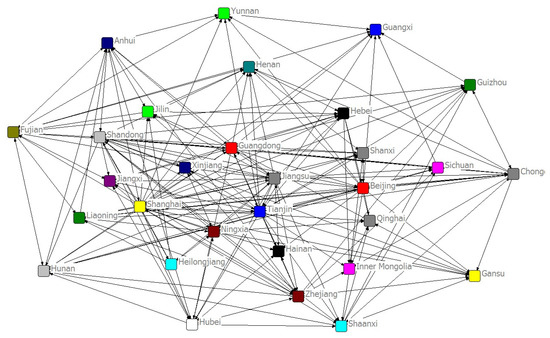 In this paper, the CONCOR module of Ucinet is used, the maximum segmentation depth is selected as being 2, and the centralized standard is 0.2. A total of 30 provinces nationwide were divided into four blocks (as seen in Table 5). There are six members in Block I,: Beijing, Tianjin, Hebei, Inner Mongolia, Jilin, and Liaoning, which mainly are provinces of the Circum-Bohai Sea Region; there are six members in Block II: Zhejiang, Fujian, Shandong, Shanghai, Jiangsu, and Guangdong, which mainly are provinces of the eastern areas of the Yangtze River Delta and Pearl River Delta; there are 11 members in Block III: Heilongjiang, Ningxia, Henan, Guizhou, Shanxi, Guangxi, Jiangxi, Yunnan, Gansu, Qinghai, and Xinjiang, which mainly are provinces in the western area; there are seven members in Block IV: Sichuan, Hubei, Shaanxi, Anhui, Chongqing, Hunan, and Hainan, which mainly are provinces in the central area.
