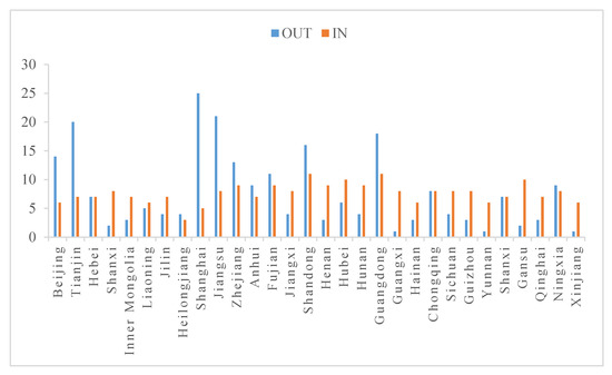 Degree centrality represents the beneficial correlations among nodes in the network, which was divided into an in-degree and an out-degree [57]. The larger numerical value of the in-degree shows that the province and city have a larger number of correlations with other provinces and cities in the network, and the larger numerical value of out-degree shows the province has a more significant ecological efficiency spillover effect on other provinces. As shown in the measurement results of degree centrality in Table 4, the average value of degree centrality of the 30 provinces nationwide is 41.609. There are 9 provinces with a degree centrality that is higher than the mean value: Shanghai, Jiangsu, Tianjin, Guangdong, Shandong, Beijing, Zhejiang, Fujian, and Chongqing in a sequence from highest to lowest. These regions have a larger number of correlations with other regions in the correlation network of ecological efficiency spatial spillover. These provinces are mainly located in southeastern coastal areas with relatively good economic development levels and high ecological efficiency. The degree centrality of Shanghai reaches 89.655 at its maximum, which is because the spillover correlation of the regional ecological efficiency of Shanghai has a spatial correlation with 25 provinces, showing that Shanghai enjoys the central position in the spatial spillover correlation network of China’s regional ecological efficiency. Provinces with a degree centrality that is higher than the mean value are located in coastal areas except for Beijing and Chongqing, showing that coastal areas have very strong influences on the spatial spillover correlation of overall ecological efficiency in China. However, according to the measurement results of Table 3, the degree centrality ratings of Hainan, Yunnan, Qinghai, Heilongjiang, and Xinjiang occupy the last five positions nationwide, showing that the spatial spillover of ecological efficiency of these regions has less correlation with other regions. The reasons for this are possibly their quite small economic scales and relatively remote geographical locations. Thus, their ecological efficiency spatial spillover has a worse spatial correlation with other provinces.