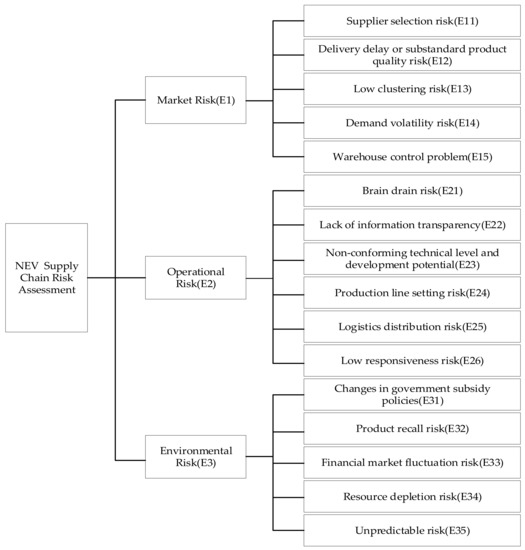 Thus, the research on new energy vehicles mainly focuses on technology [6,7,8], operation mode [9,10,11,12], environmental protection assessment [13,14,15], market demand analysis [16,17], and so on. For example, Perera et al. proposed a charging infrastructure planning model in the urban environment. The case study shows that the model can select the best capacity and location of electric vehicles, maximize the coverage service, and minimize the life cycle cost [18]. Lin et al. investigated the positive significance of electric vehicle policy on the environment by establishing models to conduct scenario analyses [7]. Okada and many other scholars analyzed the market demand of new energy vehicles from various perspectives, including perception, personality, and environmental awareness, etc. [19,20,21]. Nowadays, electrification, networking, intelligence, and sharing are becoming the development currents of automobile industry, which will lead to enormous changes in the structure of the supply chain and suppliers. More and more voices are calling for the establishment of an efficient and high-quality supply chain for new energy vehicles. However, in virtue of its bulkiness and complexity, it faces many risks in the transformation and innovation stages. Consequently, there is a tremendous necessity to assess the risks faced by the supply chain of new energy vehicles in this period; yet there are relatively few studies on the risk assessment of the NEV supply chain [22,23]. Most studies only focus on a single risk factor, and a comprehensive and exclusive assessment of NEV supply chain risk in the transition period is rarely involved. Li et al. studied the influence of subsidy policy on the production decision-making of new energy vehicle manufacturers, and concluded that for new energy vehicle manufacturers considering battery recovery, battery recovery rate, and subsidy policy have a key impact on their competitive position [24]. Kalaitzi et al. discussed the relationship between and the influence of supply chain enterprises on the production process of electric vehicles through a specific case analysis [25]. Only Wu et al. used the fuzzy synthetic evaluation method to evaluate the risk of China’s electric vehicle supply chain, and found that for the moment, the risk associated with China’s electric vehicle supply chain mainly comes from technical risks and market risks [26]. On the other hand, in terms of the methods of risk assessment, scholars generally adopt analytic hierarchy process (AHP) [27], technique for order preference by similarity to ideal solution (TOPSIS) [28], and fuzzy comprehensive evaluation [26,29]. Mihalis and Thanos applied the failure mode and effect analysis technique (FMEA) to identify and assess the sustainability-related risks of supply chain, and tested the potential correlation between the identified risks, and then gave reasonable suggestions [30]. Song et al. proposed a rough weighted decision-making and trial evaluation laboratory (DEMATEL) to identify critical risk factors in sustainable supply chain management [31].