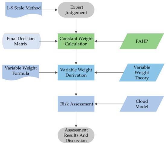 In order to avoid the subjectivity and limitation of the decision-maker, this paper uses fuzzy analytic hierarchy process (FAHP) to determine the constant weight of risk factors. Then we propose to use the variable weight formula of incentive mechanism to modify the constant weight, which can reflect the balance of each level in the comprehensive evaluation. The combination of the two methods can avoid the abnormal data of critical criterion, which cannot be fully reflected in the evaluation results. Considering the randomness and fuzziness of expert evaluation data, this paper applies cloud model to NEV supply chain risk evaluation based on the above, which can solve the problem of a too rigid boundary of level interval division. The detailed risk assessment process is shown in Figure 2.