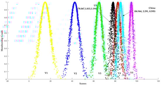 In order to further verify the external effectiveness of the model, the supply chain of American new energy vehicles was selected for analysis in this paper. The results are shown in Figure 5. According to Figure 5, it is obvious that the supply chain risk of NEV in the U.S. is lower than in China, but it is also at a high level. The primary cause for this phenomenon may be that it is currently in the exploratory stage of electrification. The new power of automobile building represented by Tesla in the U.S. has become the pioneer of the NEV market by taking advantage of its first mover advantage and Internet gene. Compared with the current situation of NEVs in China, Tesla’s technological superiority occupies the main position, with high technical barriers and product leadership, such as energy density and charging speed [74,75]. However, it is worth noting that the super entropy of the comprehensive cloud of the NEV supply chain in the U.S. is 1.194, which is much larger than that of China. This is mainly due to the fact that the industrial chain of China’s NEV is more complete from a global perspective, and the pattern of all links in the whole supply chain is becoming more and more clear. Conversely, the shortage of raw materials and capacity of lithium batteries in the U.S. has led to its long-term dependence on mineral imports, which is a passive situation in terms of global competition. China produces nearly two-thirds of the world’s lithium batteries, compared with just 5% in the United States, according to Benchmark Minerals Intelligence, which tracks lithium and other commodity prices [76]. This makes it urgent for the United States to improve its lithium battery production capacity and conduct research on new battery technologies to break the supply bottleneck. Therefore, the value of Chinese manufacturing assets starts to stand out and its future growth is highly certain. By contrast, although the U.S. government takes various measures to strengthen the self-sufficiency of the NEV supply chain, there is still a great amount of uncertainty in the current trend of global electrification.