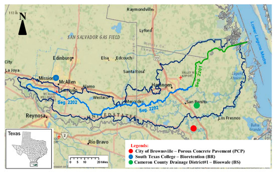 Map of the Arroyo Colorado Watershed and site locations of monitored porous concrete pavement, bioretention, and bioswale within the Lower Rio Grande Valley in Texas [13].