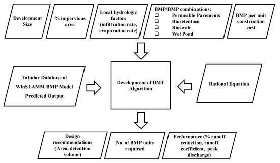 The DSS was developed as an innovative calculator for the LID footprint planning in a proposed commercial development to meet the 10-year discharge goal from a 50-year rainfall event. As a planning tool, the DSS algorithm has been written in the Visual Basic programming language and formulated as a macro-enabled Excel spreadsheet to support the discharge calculation as a basis for BMP planning. The user has control over the selection of a city, which is linked to the local soil characterization parameters (runoff coefficient, surface infiltration rate, etc.). Feedback from local engineers/planners/stakeholders was gathered to assess city-specific hydrologic and geologic information. The tool was successfully designed to accept input parameters, such as development size, predeveloped land cover, evaporation rate, type of BMP(s), and per unit construction cost. The database and algorithm of the DSS were generated from the output resulting from the assessment, evaluation, and field-calibrated WinSLAMM model of three BMPs (permeable pavements, bioretention, and bioswale). The tool was designed to provide the outcomes, such as required BMP footprint, detention volume, size, and the number of BMP units needed to accomplish the objectives. The tool can predict the uncontrolled and controlled performance of the site in terms of peak discharge, total runoff volume, percentage of runoff reduction, runoff coefficient, etc. The tool is also able to estimate the total lifecycle cost of BMP(s). Figure 2 shows the overall framework of the DSS for the accomplishment of the objective of this study.