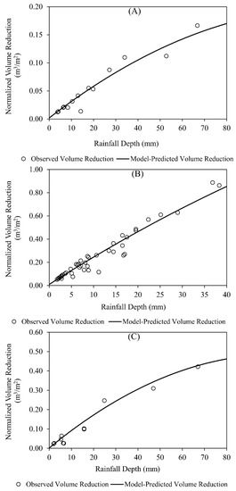 Calibration plots for WinSLAMM Best Management Practice (BMP) models: (A) porous concrete pavement (PCP), (B) biodetention (BR), and (C) bioswale (BS).