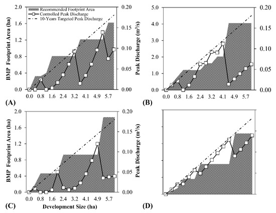 Graphical representation of DSS-simulated results to assess the effect of the size of commercial development on the recommendation of LID footprints and controlled peak discharge: (A) wet detention pond (WP), (B) porous concrete pavement (PCP), (C) bioretention, and (D) bioswale.