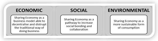 - Economic—Sharing economy as a business model that is able to decentralize and disrupt the traditional way of doing business: The use of internet platforms, the related development of crowdfunding initiatives, and the increasing accessibility of underutilized assets, have been described as opportunities to empower individuals and promote the development of micro-entrepreneurs [2]. The possibility to trade outside the traditional market system, where large corporations and bureaucracy drive the market dynamics, contributed to shape the idea that the sharing economy can disrupt the traditional way of doing businesses by increasing income possibilities and opportunities [1,33]. In addition, the use of peer-to-peer platforms and the related reduction of searching and transaction costs are considered as an important element of savings, income redistribution, and wealth [34,35].