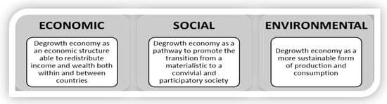 - Content analysis: By reviewing the full text of the selected material, the spectrum of theoretical frameworks used to define the sharing economy and degrowth has been grouped according to the three sustainability dimensions, namely: Economic, social, and environmental;