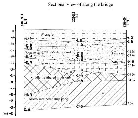 In the finite-element model, the parameters of the concrete material were assigned according to the defined specifications. The mechanical parameters of the rock layer were determined by geotechnical testing and the key data self-validation method. The required physical and mechanical parameters to calculate the constitutive equations in the model are shown in Table 1 and Table 2.