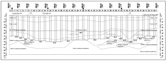 The rock and soil layers in the foundation pit were silt, muddy soil, fine sand, medium sand, coarse sand, strong weathered mudstone, middle weathered mudstone, and microweathered mudstone (Figure 1 and Figure 2). According to these geological conditions and the design requirements of the anchor body, the underground continuous wall adopted a circular structure with an outer diameter of 82.0 m and a wall thickness of 1.5 m. The elevation of the top surface of the pit was 1.00 m, and the elevation of the bottom of the pit was −35.00 to −43.00 m. The bottom of the pit was embedded in mud, siltstone, and moderately weathered mudstone strata. The underground continuous wall was divided into two sections (Section 1 and Section 2). Section 1 was three-milled, with a side groove length of 2.8 m, a middle slot length of 1.47 m, and a slot length of 7.07 m; Section 2 had a slot length of 2.8 m. The length of the Section 1 and Section 2 groove sections was 0.25 m on the axis of the ground wall, and Section 1 and Section 2 had 27 slots. Thus, the trough section was divided into 54 sections (Figure 2). The designed maximal trough depth was 46.0 m. On both sides of the underground continuous wall, a 50 cm diameter cement-powder spray was used to create a pile to reinforce the silt soil with a spacing of 40 cm and a reinforcement depth of 15.0 m. After construction of the underground continuous wall was completed, the bottom of the wall was grouted.