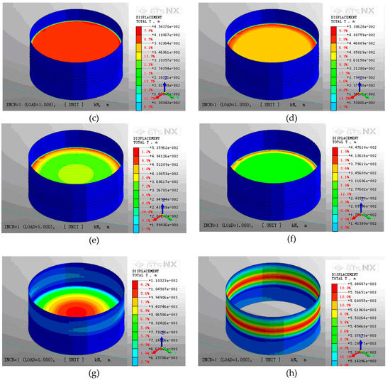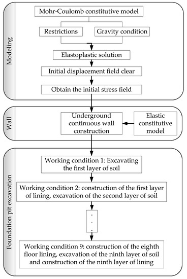 9] investigated the deep foundation pit of a steel plant in Shanghai on the basis of collected monitoring data during foundation-pit construction. They analyzed the deformation and internal structural forces of the circular underground continuous wall supporting the foundation pit that was subjected to the pressure of confined groundwater. The study focused on analysis of existing monitoring data, and did not use finite-element analysis to further demonstrate the deformation characteristics of the supporting structure. Xu et al. [