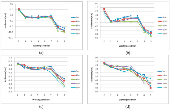 Because of the need for surface-settlement monitoring during construction, a group of sensors were arranged to the east, south, west, north, southeast, northeast, southwest, and northwest of the foundation pit. Typical settlement monitoring started from the outside of the foundation pit with 10 monitoring points arranged at equal intervals of 5 m numbered D1-i to D8-i (with i = 1–10). Due to on-site construction-monitoring points that were actually available, only the first five points of valid data were obtained. A total of eight settlement-monitoring sections and 80 surface-settlement monitoring points were set. If the points encountered obstacles, they could be moved in parallel, as shown in