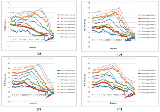 Analysis of data presented in Figure 9 yielded the following results. First, the wall deformation of each working condition was linear at an excavation depth of 27 m, and the deformation curve had segmental characteristics. The displacement of the wall body had an inflection point at a certain depth; that is, there was a peak in the displacement curve of the wall. This point gradually moved deeper with increasing depth of excavation and was generally located near the maximal excavation depth. This differed from the deformation characteristics of a cantilever pile (the lower part of the pile is fixed, and the upper part is subject to lateral thrust) because performance of the circular underground continuous wall arose from its own annular restraining force. We termed this point for each working condition the “round-underground-continuous-wall-deformation inflection point“. Additionally, for Working Conditions 2 and 3, at some stage of excavation, the bottom of the wall body deviated away from the direction of the foundation pit. This was similar to the deformation characteristics of a cantilever pile. Working Conditions 4–9 did not exhibit a reverse offset at the bottom of the wall, and the final forward offset gradually increased with excavation depth. Finally, the wall-offset curve exhibited D-type distribution (Figure 9), and the maximal offset appeared at approximately 2/3 of the excavation depth. The maximal value of the inflection point was Working Condition 9, which had an offset of 6.1 mm.