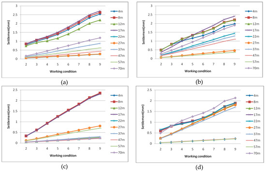 The maximal settlement value of the monitoring points was 9.9 mm. For excavation Working Conditions 1–3, surface settlement at each monitoring point increased linearly. For Working Conditions 4–6, the monitoring points generated relatively stable settlement. For Working Conditions 7–9, the settlement at each monitoring point increased linearly. The growth rate in Working Conditions 7–9 was greater than in Working Conditions 1–4 (Figure 8).