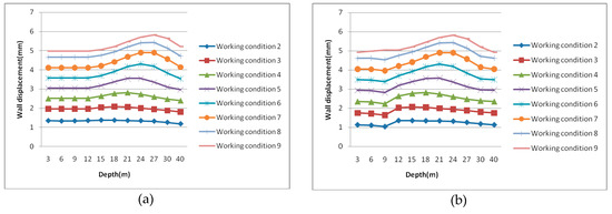 This method requires trial calculation. During research, parameters obtained from the literature and background data were used for trial calculations, and we calculated the deviation rate multiple times. Finally, the maximal simulated offsets of the walls under the second and third working conditions were 1.31 and 2.25 mm, respectively. The maximal monitored offsets of the wall for the second and third working conditions were 1.58 and 2.57 mm, respectively. That is, the difference between the simulated and monitored values was calculated. The absolute value of the difference divided by the monitoring value was used to quantify the credibility of the simulated value. It was further verified that the parameters used in the simulation were feasible. The deviation rate was calculated as follows: