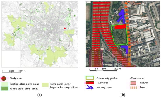 The study area: (a) the map shows the system of existing and planned green areas of the Municipality of Milan, (b) the aerial photo shows the study area inside community garden and its surroundings.