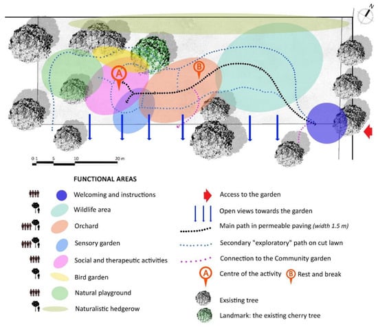 The area is wide and barren, so it was necessary to reduce it to a human scale through the design of micro-spaces, visually connected to each other and well-characterized to facilitate the understanding of the place (legibility) [36,37,38,39]. It also contributes to reduce the perception of loss and to maintain the sense of extent and of being away [36]. The project places the focal area (signed with the letter A in Figure 2) where the main activities are concentrated, mostly far from the road, near the big existing cherry tree and other groups of trees that create a niche for protection and a sense of embracement.
