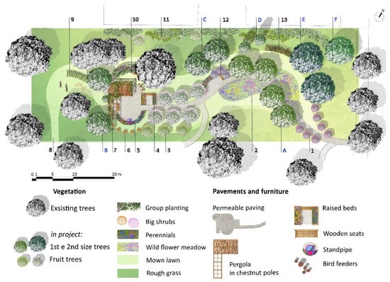 The garden is crossed by two paths, a main one with permeable paving (1.5 m wide) and an “explorative” secondary one on mown grass. The paths allow guests to visit, explore, and experience the garden according to their physical abilities and moods. The main path directs guests towards the pergola (destination point) [41] where they can rest and do community activities [72,73]; halfway through this is located a rest area (signed with the letter B in Figure 2) for those who want to stop for a moment or have a moment of privacy. This path is connected with the main path of the CG. The elderly can use it to discover other parts of CG with a round walk [35]. The secondary route leads to more individual experiences (opportunity for wandering through the landscape without time, destination, or future purpose) [44] in more naturalistic areas, among flowery meadows, trees, and shrubs typical of the plain forest, wildlife hedges with edible fruits (fascination).