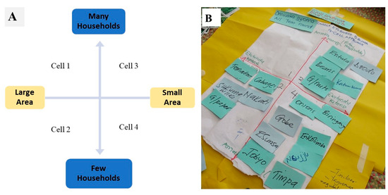 The FGDs were guided using a structured questionnaire (S1). The facilitator used a checklist to elicit information from the participants and probed for triangulation of the responses whenever necessary. Care was also taken to ensure full participation of all the FGD participants. A four-cell chart [27,28] was used to retrospectively rank the land-use for crop species or cultivar diversification trajectories and changes in the landscapes affected by XW. The four-cell is a participatory rapid rural appraisal technique created to assess agrobiodiversity and local food system flows [28,29]. It allows for a quick identification and assessment of changes in food security and diet diversity [28]. The four-cell chart ranks species abundance and distribution by looking at area under production and the number of households involved in production. This results into four cells or groupings, i.e., a species being grown on: (i) a large acreage and being produced by many households; (ii) large acreage but by few households; (iii) small acreage but by many households and (iv) small acreage and few households (Figure 2).