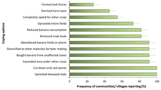 Responses and/ or coping strategies in reaction to Xanthomonas wilt (XW) across 13 different banana growing communities/landscapes in the Eastern DR Congo. Error bars represent standard errors.