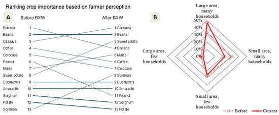 Increase in the importance and production of the 14 crops was reported to target the filling of the food security and income gap that arose from the loss of the banana crop to XW disease. Nkuba et al. [46] similarly reported increases in the area under maize, root and tuber crops on XW-affected farms in Tanzania and Rwanda. Replacement of banana with sweet potatoes and cassava after devastation by XW has also been reported in Uganda [47]. The high ranking of cassava can be attributed to its complementary role to banana as a food and income crop in these XW-affected landscapes. The increments in the area and the number of households growing coffee and taro (Figure 5 and Figure 6) is not in tandem with the drop in the rankings of these crops (Figure 4). The slight drop in the rankings for coffee and taro (cf. Figure 4) could be attributed to the urgent need to bridge the food and income gap, with quick-maturing annual crops taking the priority. This is supported by the fact that the number of households and area under coffee, taro and cocoyam relative to the period before XW outbreak had increased (Figure 5). The leap in the rank of soybean was attributed to ongoing promotion of soybean as a biological nitrogen fixation agent and source of income by international projects in the region.