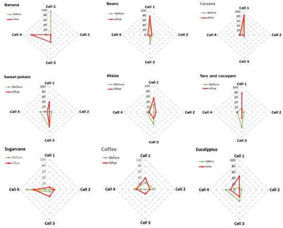 Spider plots showing the shifts in diversity (abundance) of selected key crop species before and after the outbreak of Xanthomonas wilt disease of banana across 13 landscapes in the Eastern Democratic Republic of Congo. Cells 1, 2, 3 and 4, respectively, stand for a species being grown on (i) a large acreage and by many households; (ii) large acreage but by few households; (iii) small acreage but by many households and (iv) small acreage and by few households.