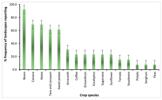 The frequency of mentioning different crop species as replacements for uprooted banana fields across 13 landscapes affected by Xanthomonas wilt disease of banana in the Eastern DR Congo. Error bars represent standard errors.