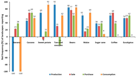 Net frequency (%) of landscapes reporting changes production, sale, purchase and consumption of key food and tree crops across 13 landscapes affected by Xanthomonas wilt disease of banana in the Eastern Democratic Republic of Congo.
